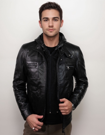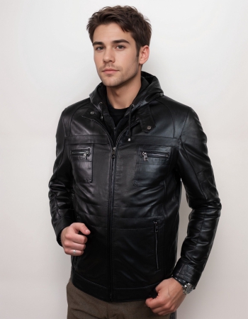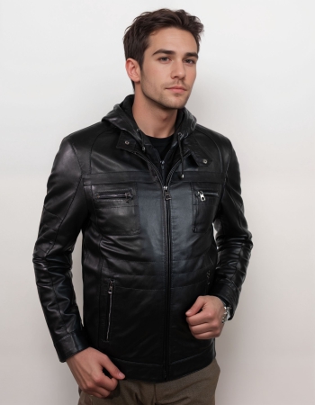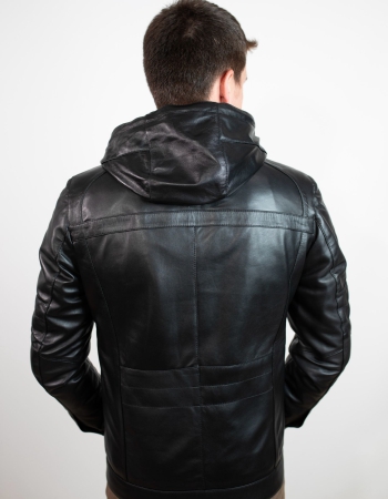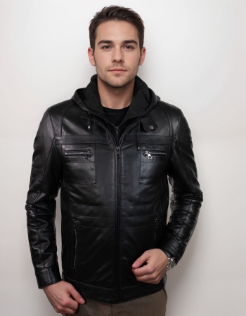 Erkek Kapüşonlu Deri Ceket - Siyah